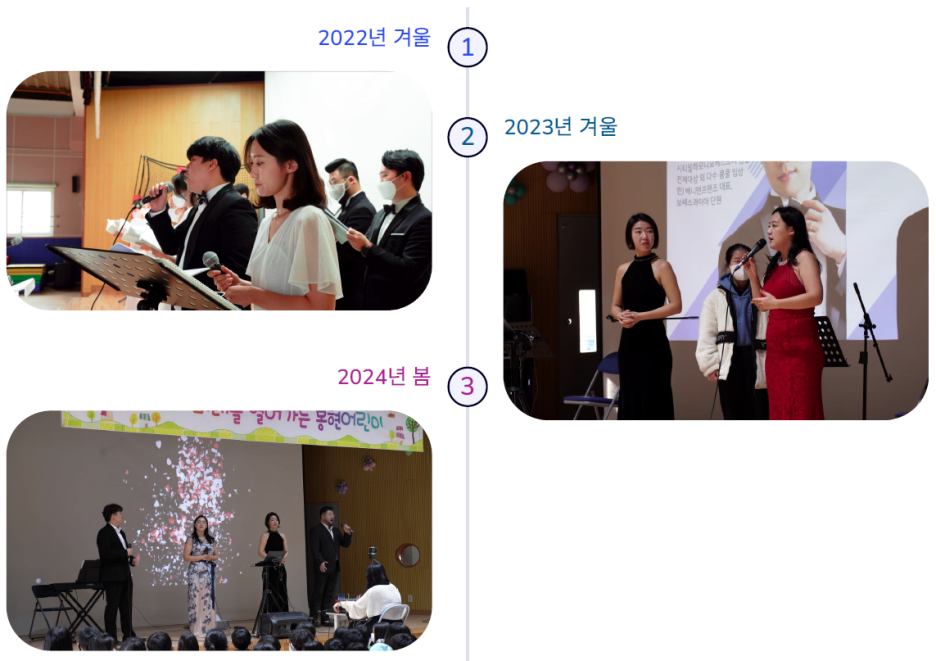 첫해에는 관악구 주민참여예산 사업비의 지원을 받아 합창음악을 선보여드렸고 그 후로는 4인의 성악중창, 3인의 현악앙상블, 미디어아트로 무대를 구성했습니다.