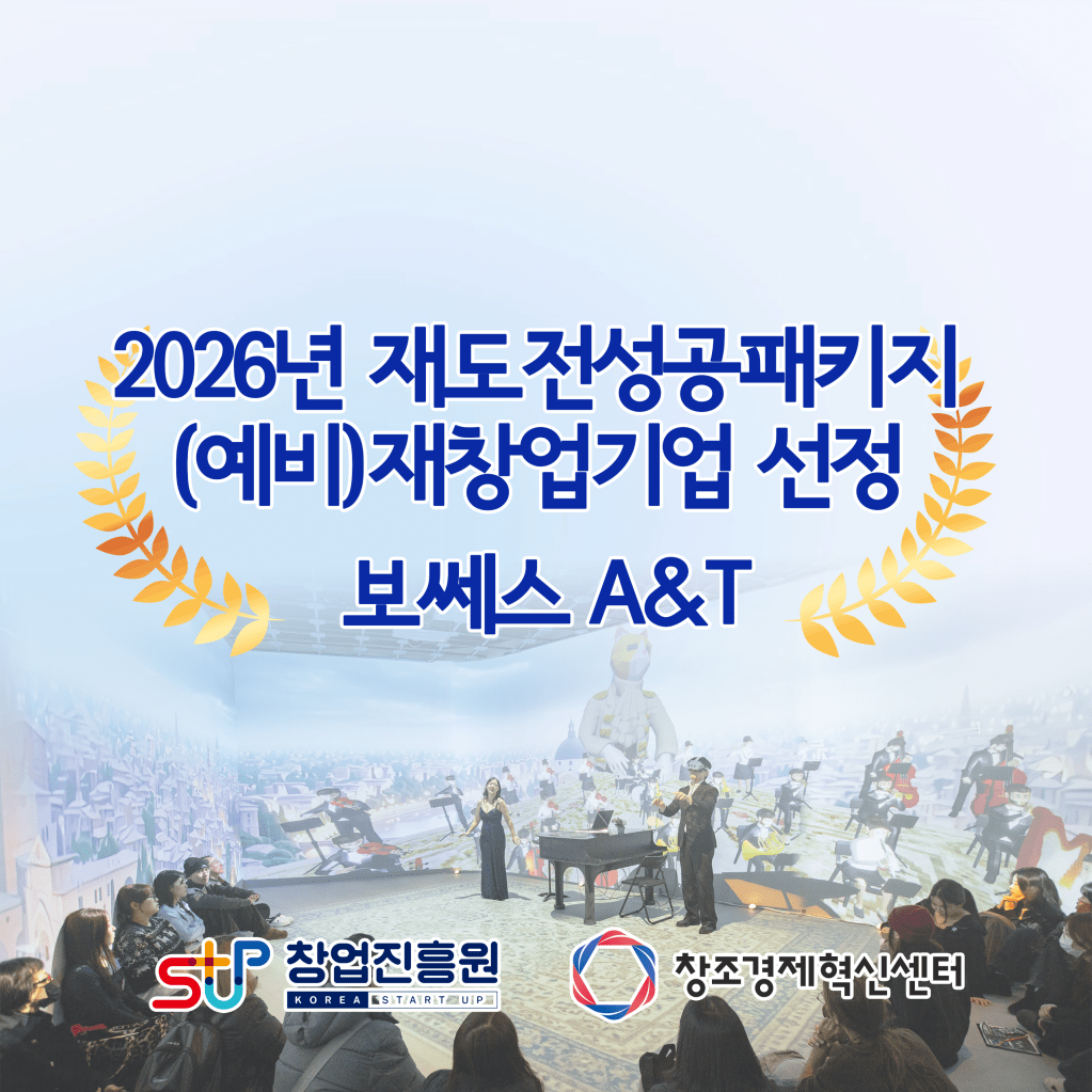 첫 공식 소식으로 전하고 싶은 내용이 있습니다. 보쎄스A&T가 중소벤처기업부의 2026년 재도전성공패키지에 선정되었음을 알려드립니다. 주관기관은 서울창조경제혁신센터이며, 2026년 4월부터 10월까지 사업을 수행하게 됩니다. 보쎄스A&T가 독립된 사업체로 출발하는 첫 해에 정부지원사업에 선정된 것은 큰 힘이 되고, 기존 보쎄스의 창작 작업과도 긴밀히 연계해 결과물을 만들어갈 수 있는 기반이 됩니다.